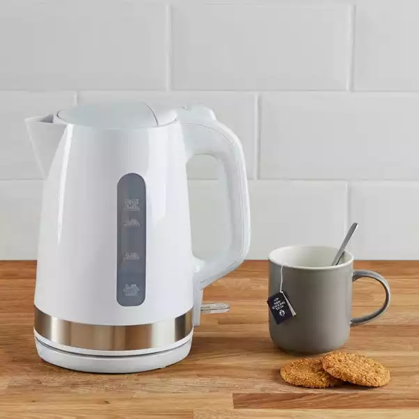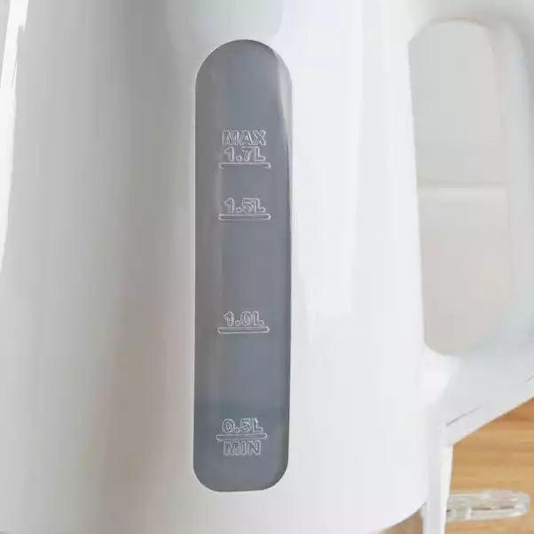 Designed with a 1.7L capacity and a 3000W power output, this plastic white kettle features an automatic opening lid for added convenience and an on/off switch with red indicator light ideal for low light situations.
