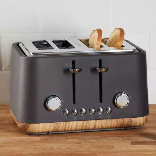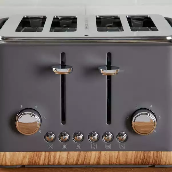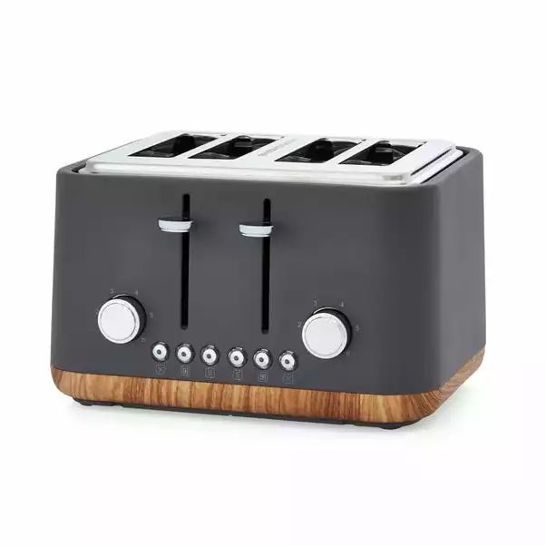 Designed in a modern matt grey colourway, this contemporary 4 slice toaster offers 1750W power output with variable width bread slots with centering guides suitable for the whole family. With Lift & Look function for added convenience, this 4 slice toaster features defrost functions for frozen bread, reheat functions for bread already toasted and mid cycle cancel functions.