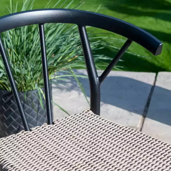 Enjoy dining al fresco with this beautiful 4-seater outdoor dining set. Made from robust aluminium and rattan for long-lasting use, this stylish contemporary set will bring a touch of sophistication to your outdoor space. Its tempered glass top ensures a clean and smooth surface, so you can dine in style whatever the weather. Perfect for garden get-togethers!