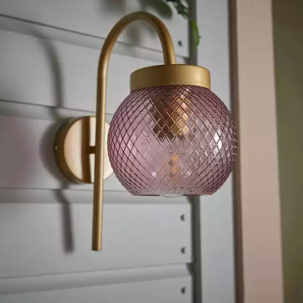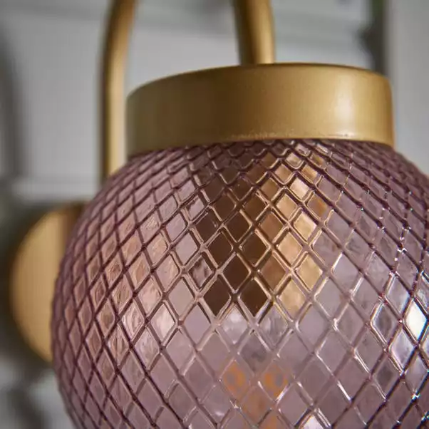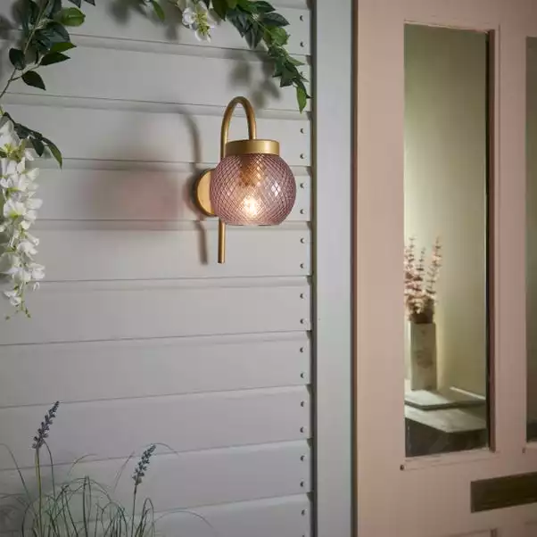 Boasting a beautiful mdoern retro styling, the Ruthy wall light would add a classy touch to any outdoor space. this wall light is finished in a satin gold colour, and paired with a textured, pink tinted glass shade and features an IP44 rating.