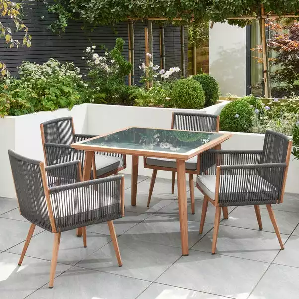 Dine in style this summer with the stunning Elements rope 4 seater dining set, featuring 4 stylish chairs and one dining table with a glass top. Made from light weight and durable aluminum. The chairs are beautifully designed with grey rope and gorgeous tapered legs, complete with padded seat cushions for added comfort and support. This dining set is the perfect addition for any modern garden.