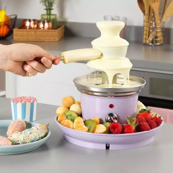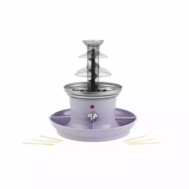 Add a pop of pastels to your next party, event or special occasion with this three tier cascading chocolate fountain from the Giles & Posner Sorbet collection. Perfect for fruit, mini donuts and popcorn; dip marshmallows for an irresistible treat. Simply fill the included food trays, add your favourite chocolate and use the included bamboo skewers to enjoy delicious dipping fun. Boasting a sleek metallic purple body, the tower and auger is removable for a quick and easy clean once used.