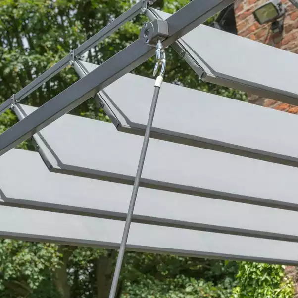 This stunning Pandora Pergola adds an extra sheltered space to your garden. Boasting a modern stylish design, this pergola is crafted from aluminium and steel making it durable and strong. The textaline allows rain to pass through this slatted multi-directional roof.