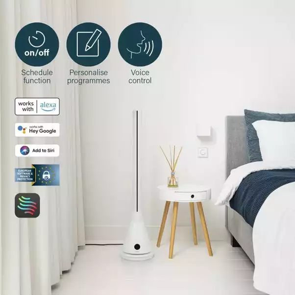 Great for cooling or heating, the multifunctional Princess Smart 2 in 1 Fan is suitable for any time of the year and day with versatile settings and temperature range of 16 °C to 30 °C. Designed with easy operation in mind, you can be control the power, speed and temperature from the comfort of your sofa or bed with the remote control, smartphone via the HomeWizard Climate app or voice control (Google Assistant, Siri & Alexa). This slim and elegant fan is built with an unobtrusive 56 decibel level, switched on and off automatically by setting schedules in the app or using the timer function and can create a pleasant indoor climate with 4 heat settings for comfortable warmth and 10 powerful speed setting for a cooling breeze.