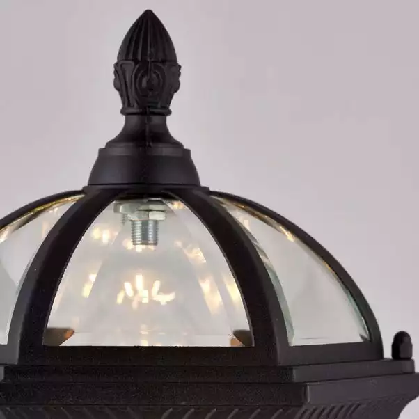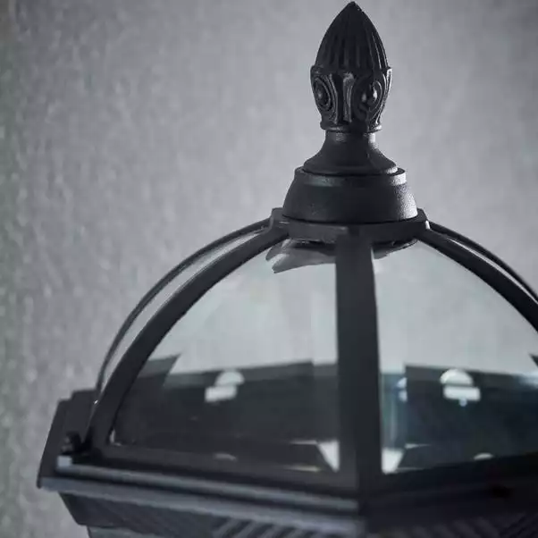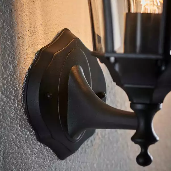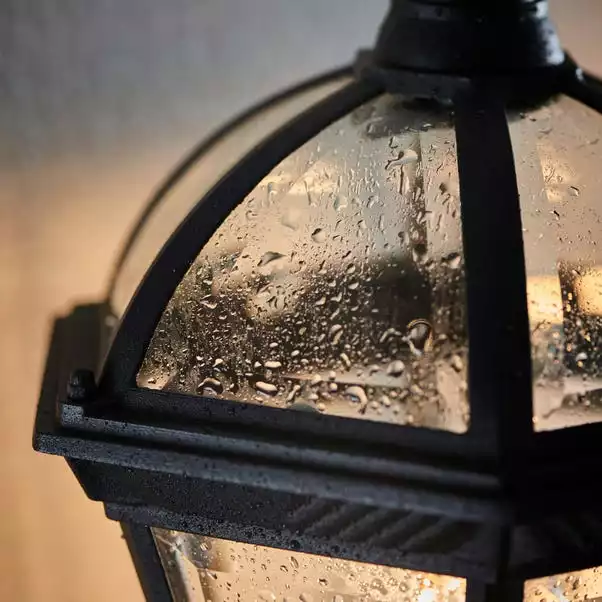Light up the exterior walls of your house with this traditional lantern style wall light. Safe for outdoor use with a IP44 rating, this dimmable light with a clear glass shade is made from die cast aluminium in a painted matt black textured finish and has a classic yet durable style.